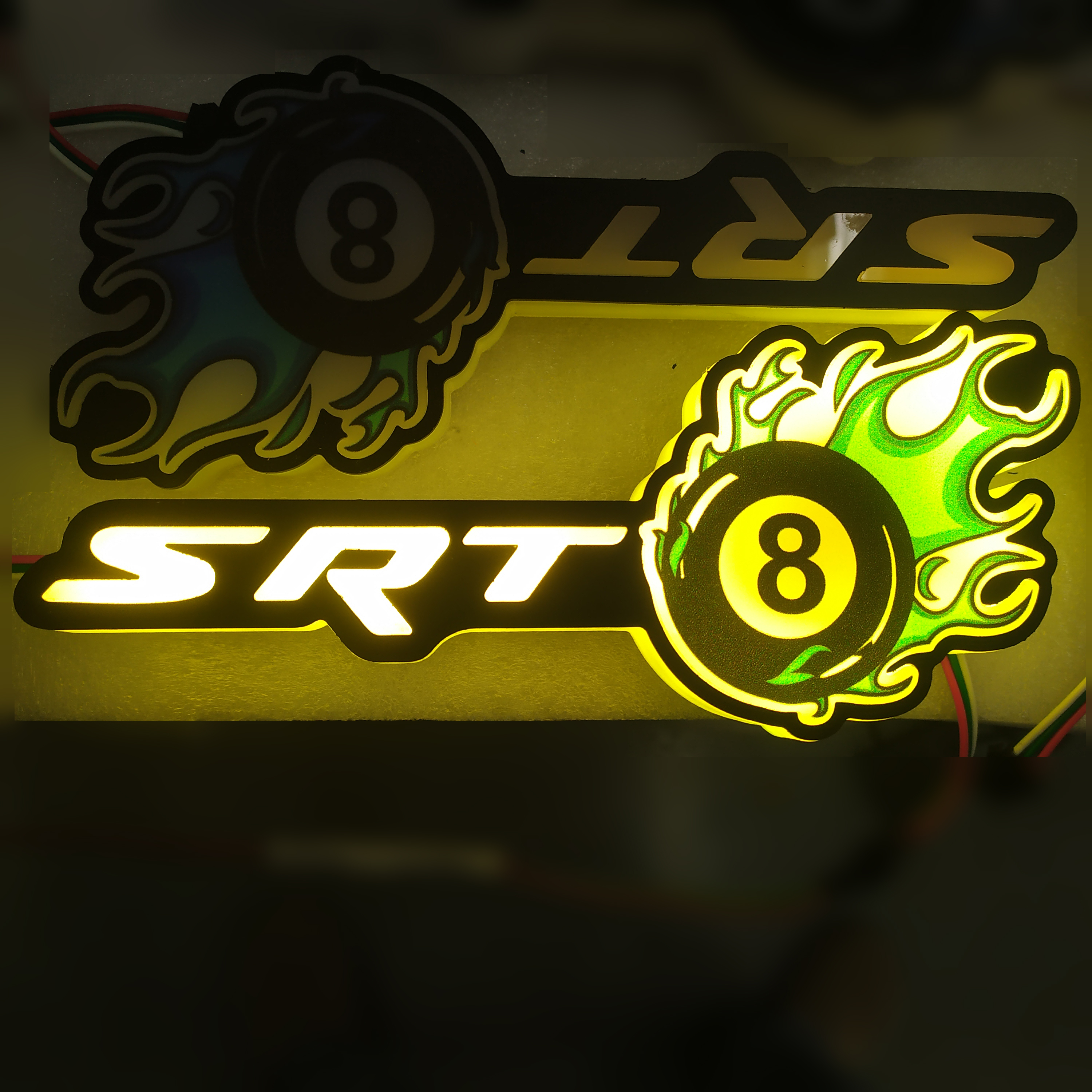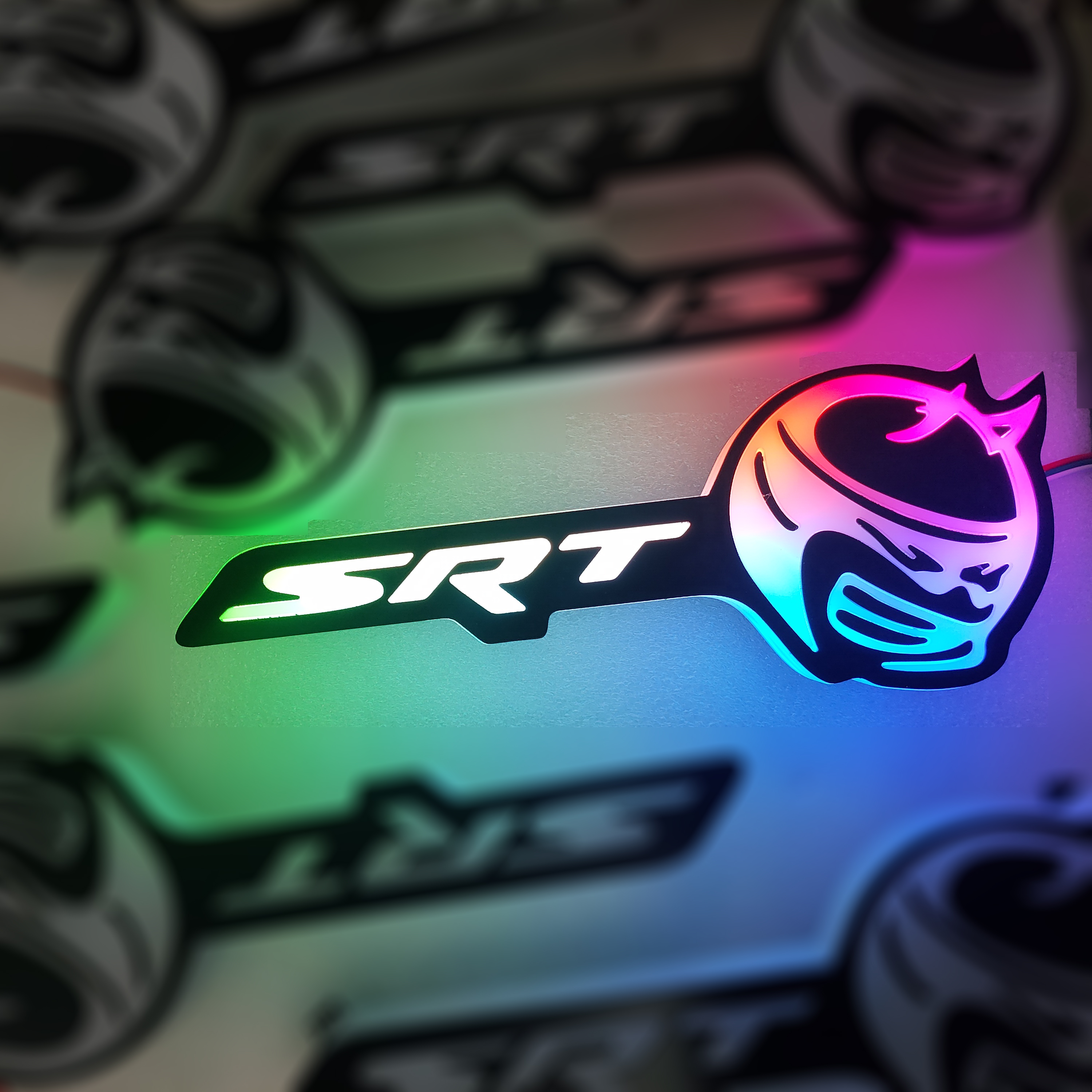 As seen in our latest project photos, we have successfully crafted stunning illuminated logos featuring iconic automotive designs (like the SRT and Hellcat styles shown for demonstration). These aren’t just stickers; they are 3D engineered acrylic sculptures that come alive with light.